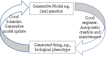 Interestingly epistemic value has been labelled a good scientist and extrinsic value a crooked scientist (8; 7). The latter because this formulation seems to imply that extrinsic value skews the evidence to support the model, as a crooked scientist would manipulate evidence to support a favoured theory – an activity that is verboten for scientists. But this is a misunderstanding as extrinsic value is maximized when a generative model is followed precisely so that the outcome is as predicted. Generative models, such as (epi) genetics, are autopoietic as they are detailed instructions for the creation and maintenance of a generated thing. A less pejorative term than a crooked scientist is a good engineer, who precisely follows engineering models, for example, of a bridge, and endeavours to have the actual bridge turn out precisely as predicted by the model. Or, following our biological example, when a phenotype develops precisely in accord with its (epi) genetic model. We may say that the good engineer constructs the evidence it seeks by precisely following the instructions of its generative model.